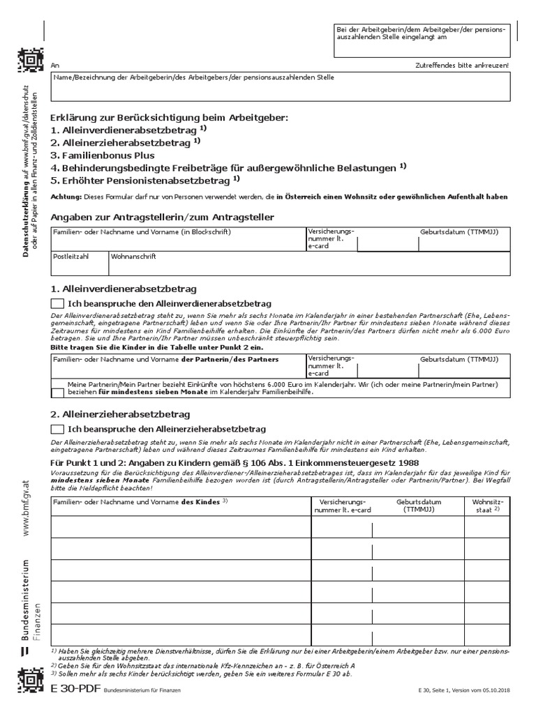 Wer schon ab Jänner im Weg über die Lohnverrechnung vom Familienbonus profitieren will muss lediglich das Formular E30 ausfüllen und dem Arbeitgeber unter. Den Absetzbetrag gibts aber nur auf Antrag. Voraussetzungen für den Anspruch auf Familienbonus Plus.